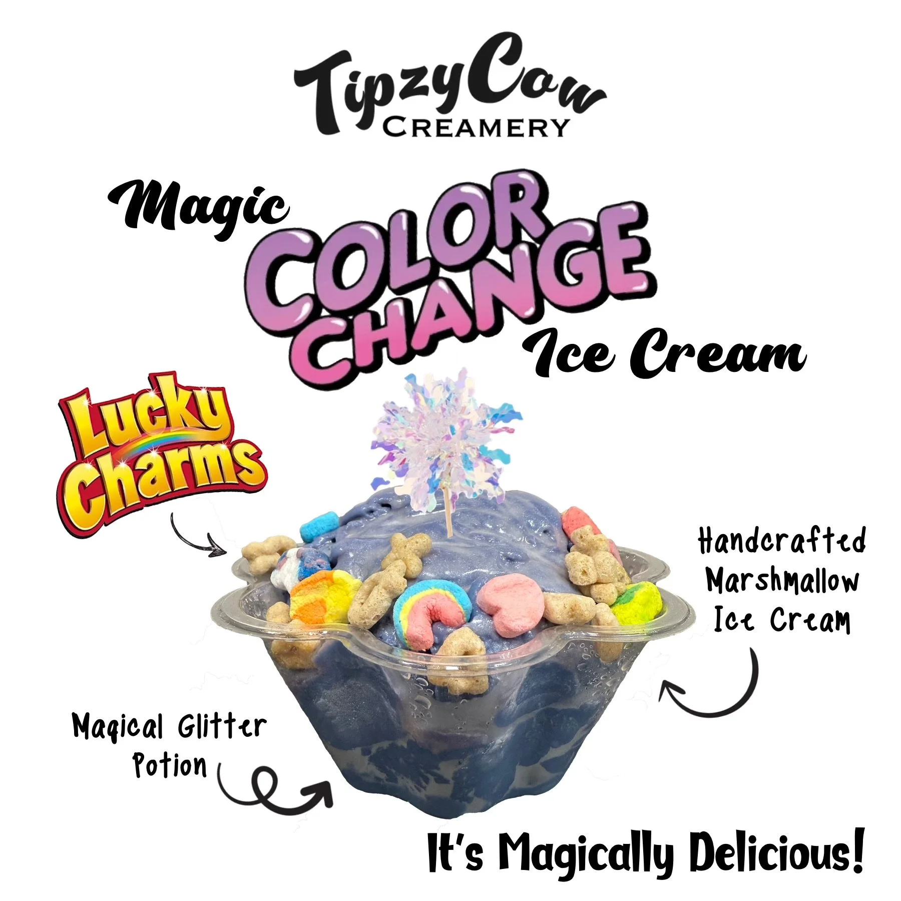 We wanted to do something different and fun and tried to think outside the box! So we decided on a color changing ice cream! Then paired it with Lucky Charms to make it even more magically delicious!!!